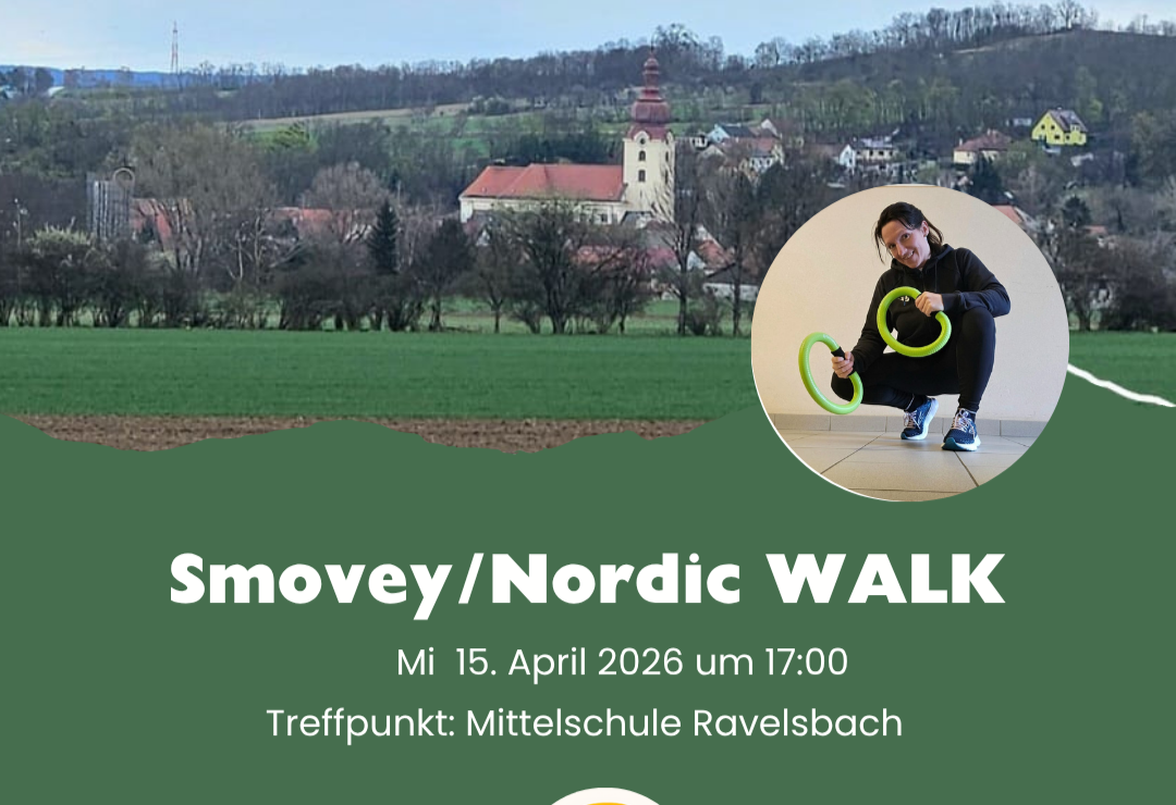 Bei diesem Treffen walken wir gemeinsam rund um Ravelsbach – in angenehmer Gesellschaft. Ob mit Nordic Walking Stöcken oder mit Smovey-Ringen (die du dir gerne ausleihen kannst) – die Bewegung an der frischen Luft tut einfach gut und bringt neue Energie.
